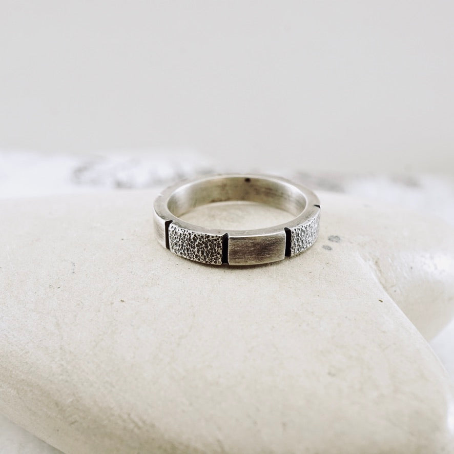 A bold silver band with a strong presence. Hand-fabricated from substantial 4x2 mm sterling silver band, this ring has textured sections that contrast against smooth polished areas, creating a rhythm of light and shadow.