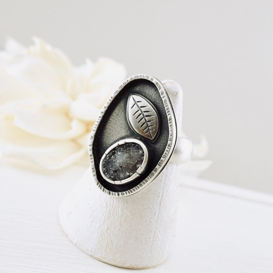 This one-of-a-kind ring features a sparkling natural druzy framed in a silver shadow box with a simple leaf detail. The contrast between the darkened background and the bright stone makes the texture pop beautifully. I gave it a half-round shank so it feels comfortable for everyday wear. A little sparkle, a little nature, and a lot of character.