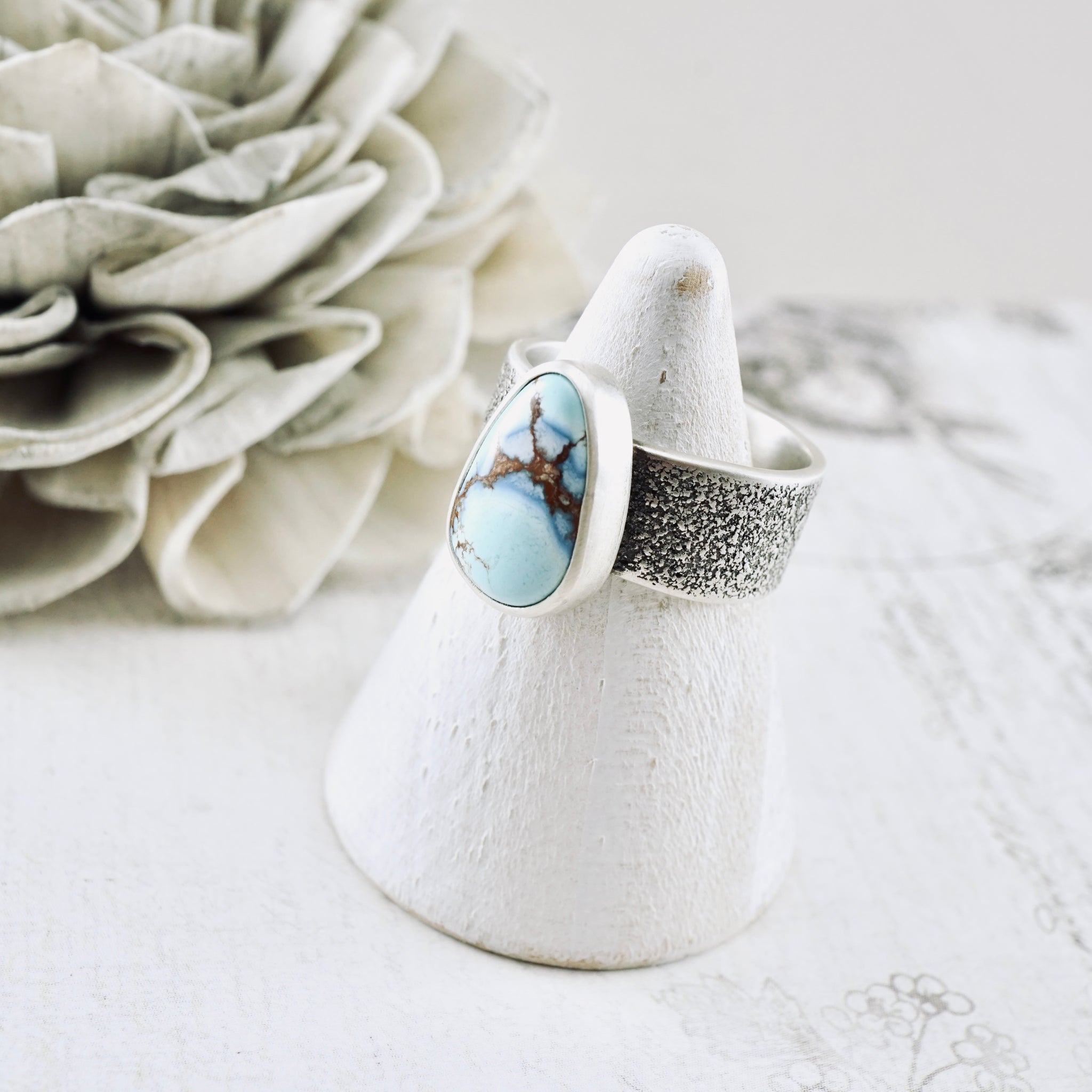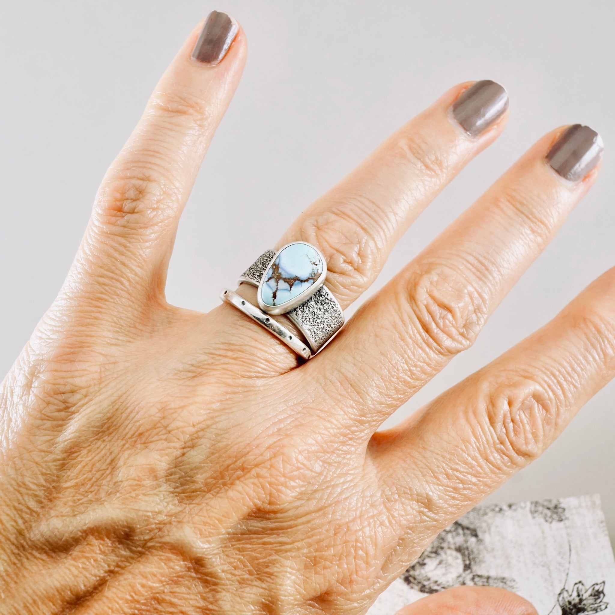 This silver dust ring features a gorgeous Golden Hill lavender turquoise, a highly collectible stone known for its sky-blue to lavender tones with rich brown matrix. Golden Hill turquoise comes from a rare mine in Kazakhstan, named for the golden-brown hills in the region. Its unique color and limited availability have made it one of the most sought-after turquoise varieties today.