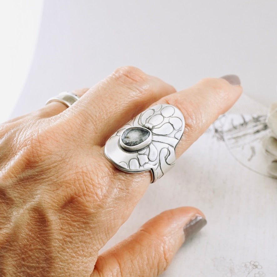 A bold statement ring with layers of silver and detail. I created this saddle-style open band from double layers of sterling silver, imprinting it with a botanical pattern using one of my own etched plates and rolled through my mill. The centerpiece is a faceted moss aquamarine with soft ocean tones and natural inclusions that make every angle unique. This piece has substance while still being comfortable thanks to the open band. Strong, textured, and one-of-a-kind, it’s the kind of ring you build an outfit around.