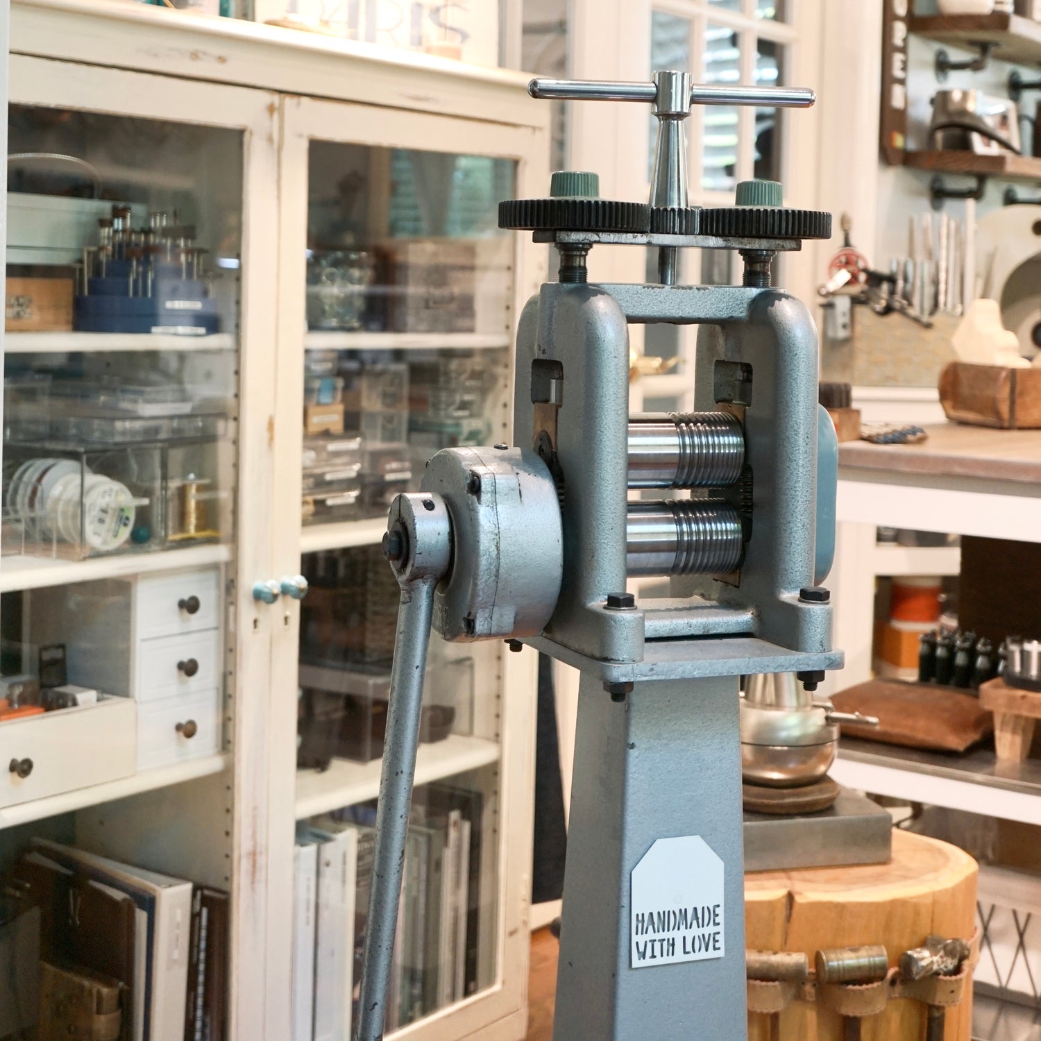 And then there’s my pride and joy: an old Filli Cavallin rolling mill. I found this beauty at a yard sale, abandoned and rusty. With a lot of love and some serious elbow grease, I restored it to its former glory. Now it’s one of the most cherished tools in my studio, ready to roll out new creations and imprinting interesting patterns.