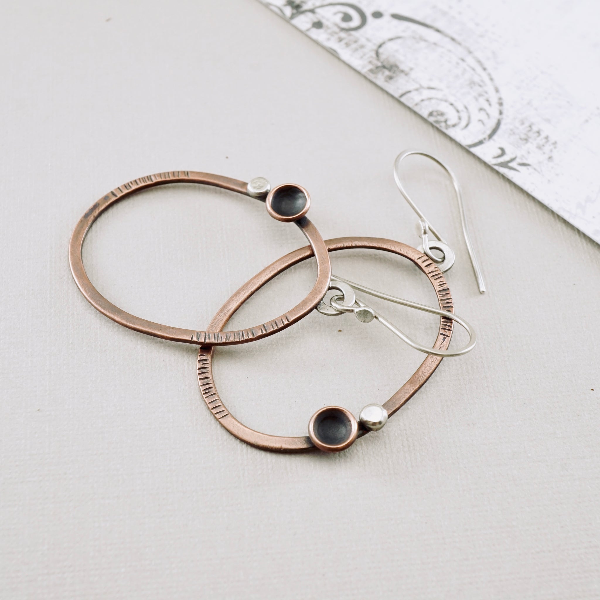 Hand-forged from warm copper with Sterling Silver accents and ear wires, these earrings are simple, elegant, and full of movement. The combination of metals creates a soft contrast that’s both earthy and refined — perfect for everyday wear.
