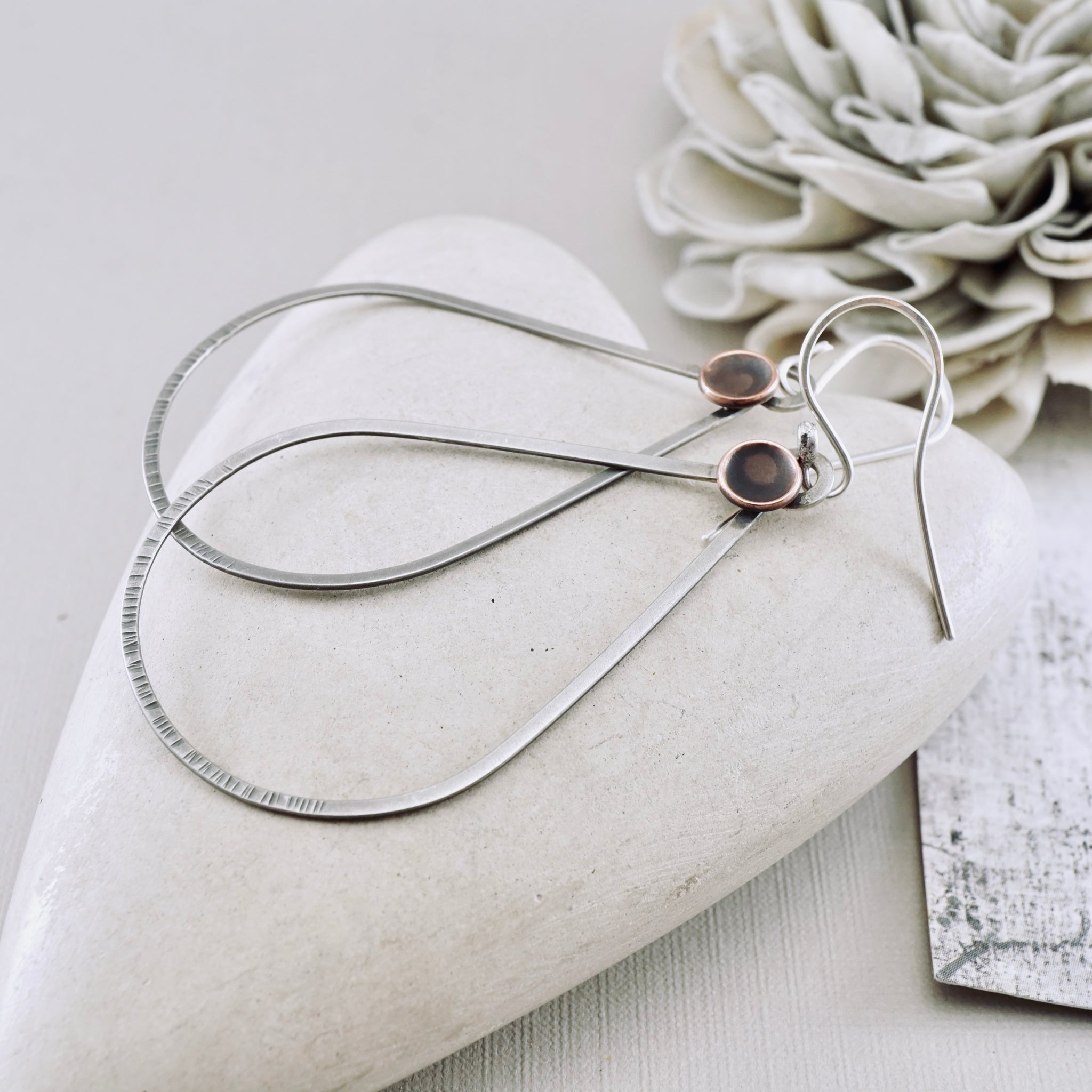 Minimal yet expressive, these hand-forged Sterling Silver earrings feature elongated teardrop loops with a light hammered texture and a small copper dome accent that adds warmth and contrast. Their airy silhouette makes them the perfect pair for everyday wear — simple, sculptural, and effortlessly modern.