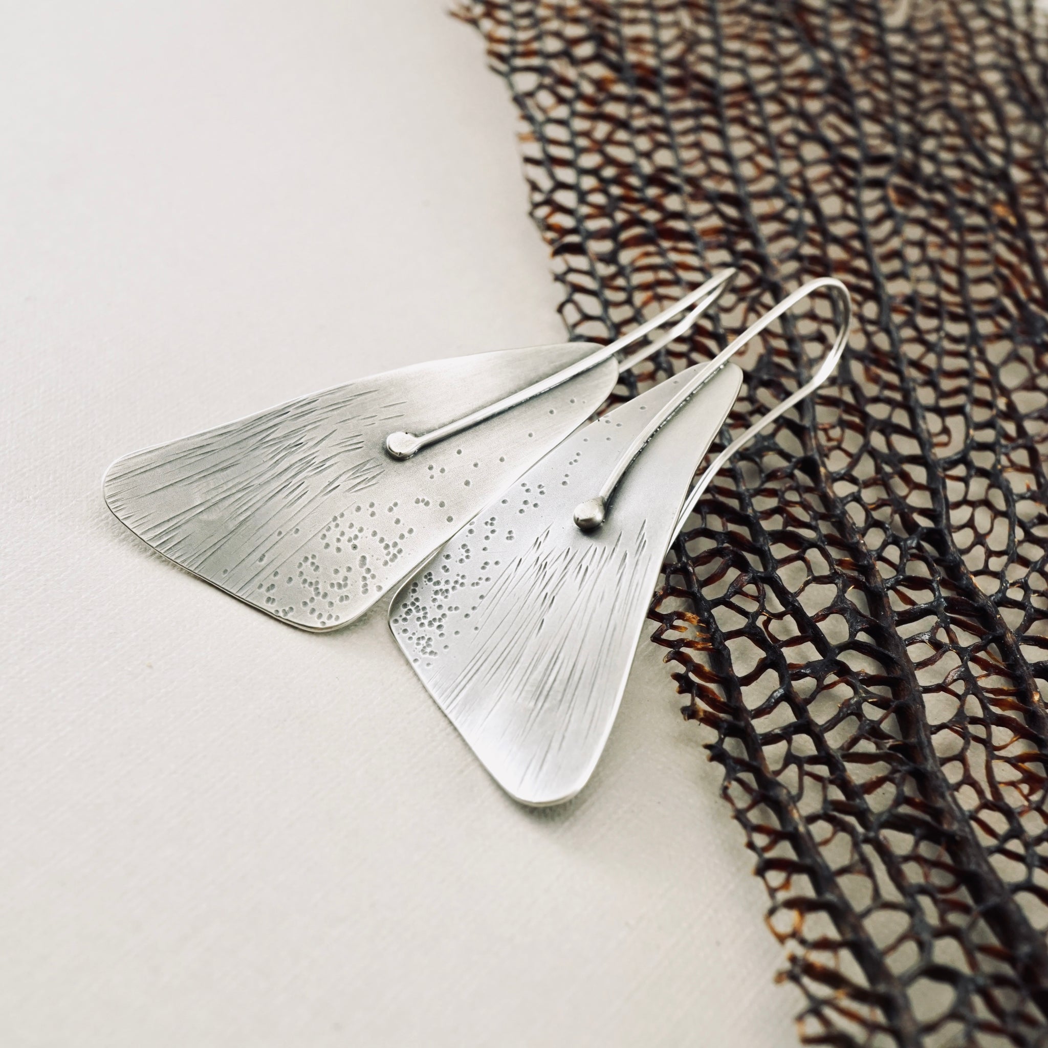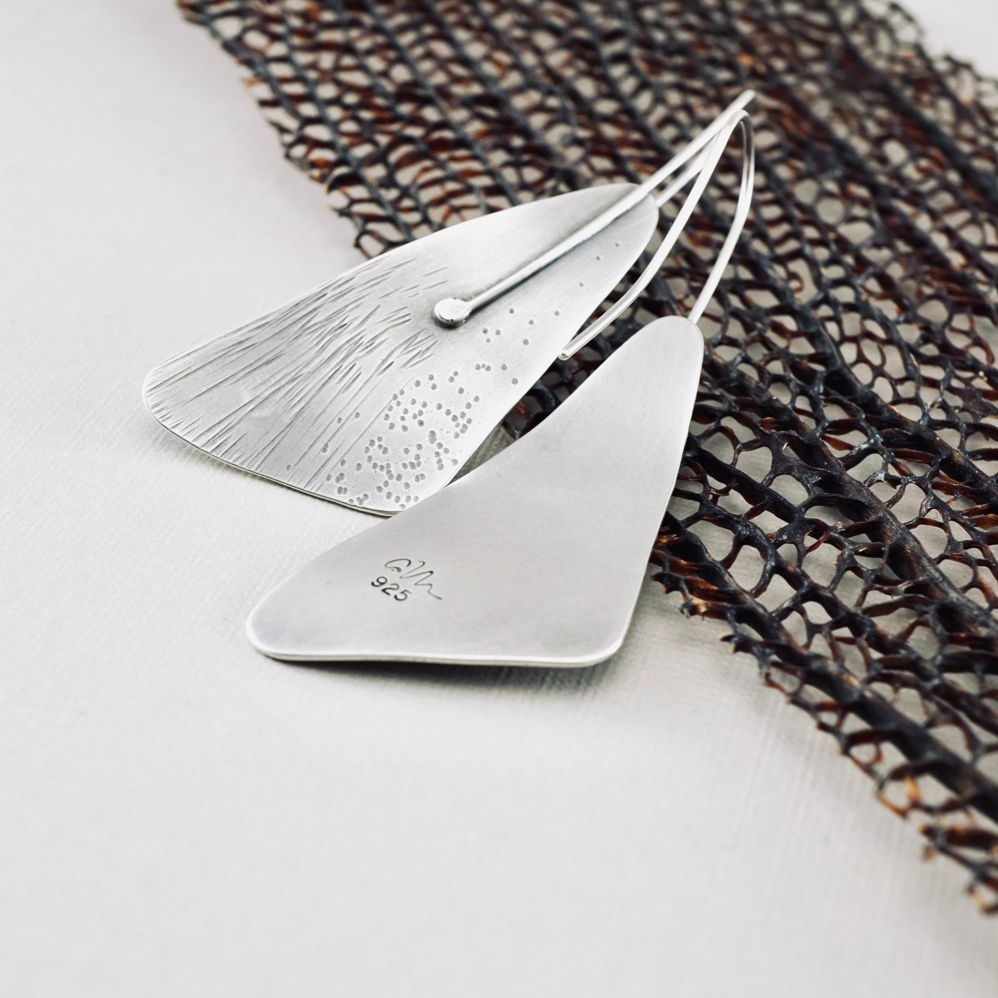 These earrings were inspired by the soft rhythm of reeds swaying by the water’s edge. Hand-forged in Sterling Silver, each petal-like shape is textured and dotted with care, echoing the quiet beauty of river currents and wind patterns. Their modern delta form gives them a touch of edge, making them a great match for any outfit.