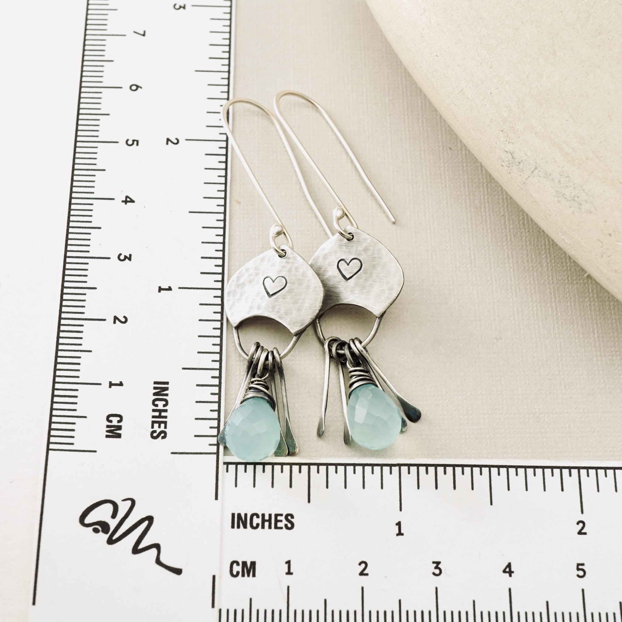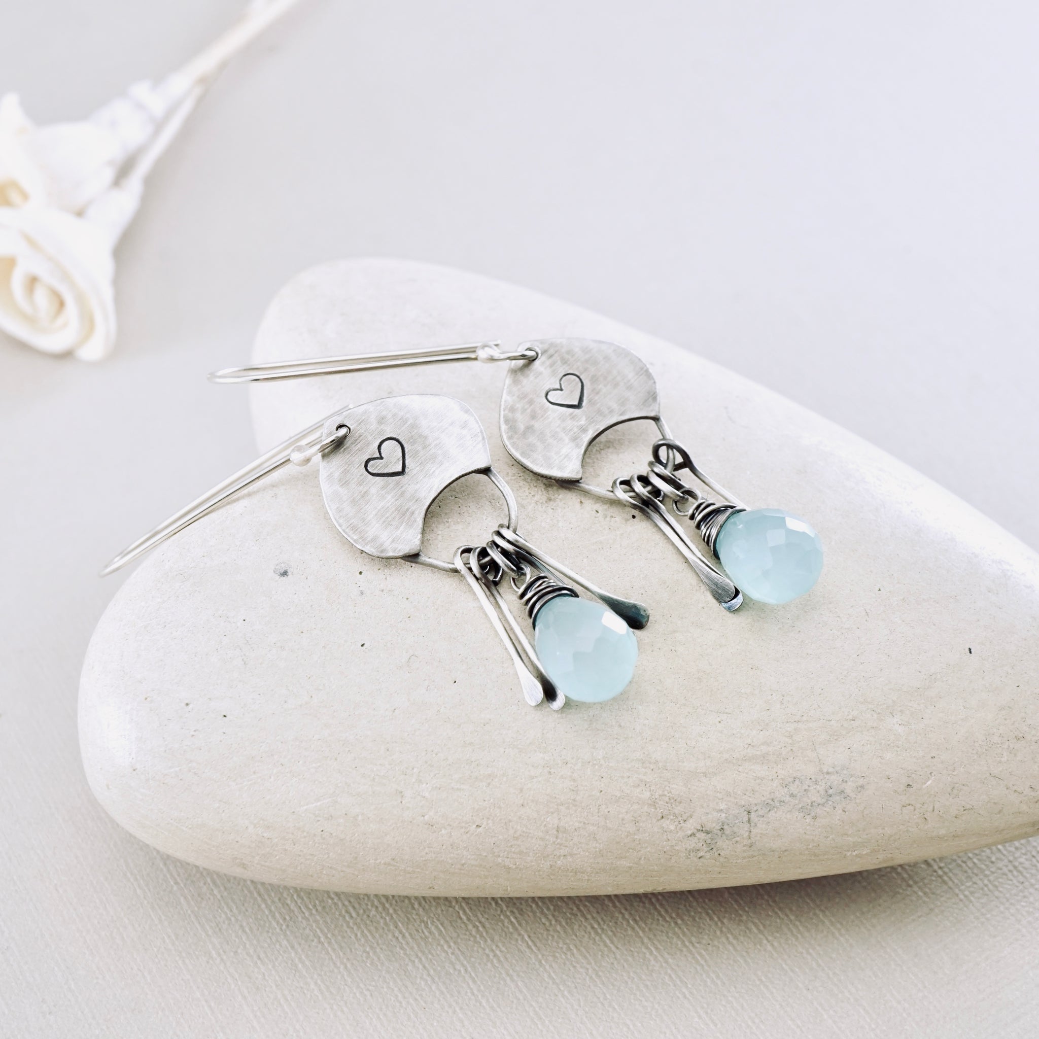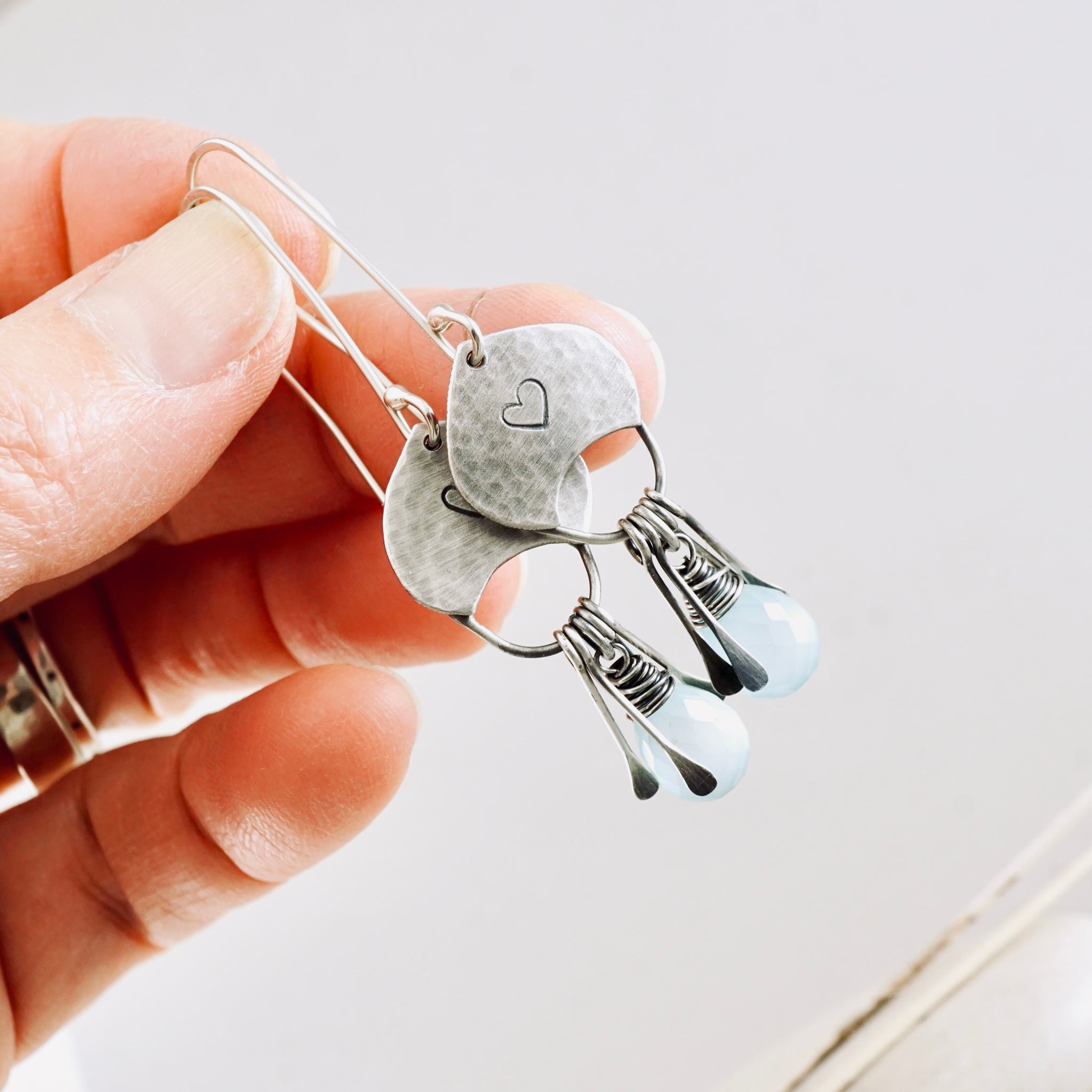 Faceted chalcedony drops add a soft glow, wrapped by hand in sterling silver and paired with delicate dangling silver elements that catch the light with every movement.