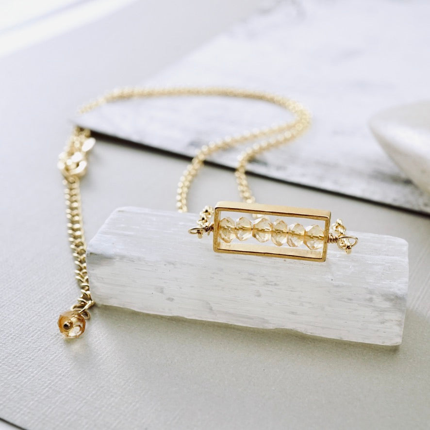 Materials: genuine citrine rondelles, gold vermeil bar frame (Gold vermeil is genuine Sterling Silver that has been plated with a thick layer of 14k–24k gold.), gold-filled rollo chain.