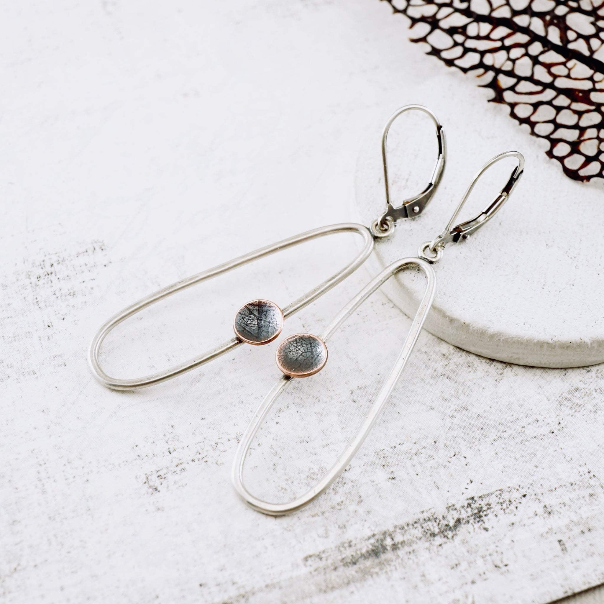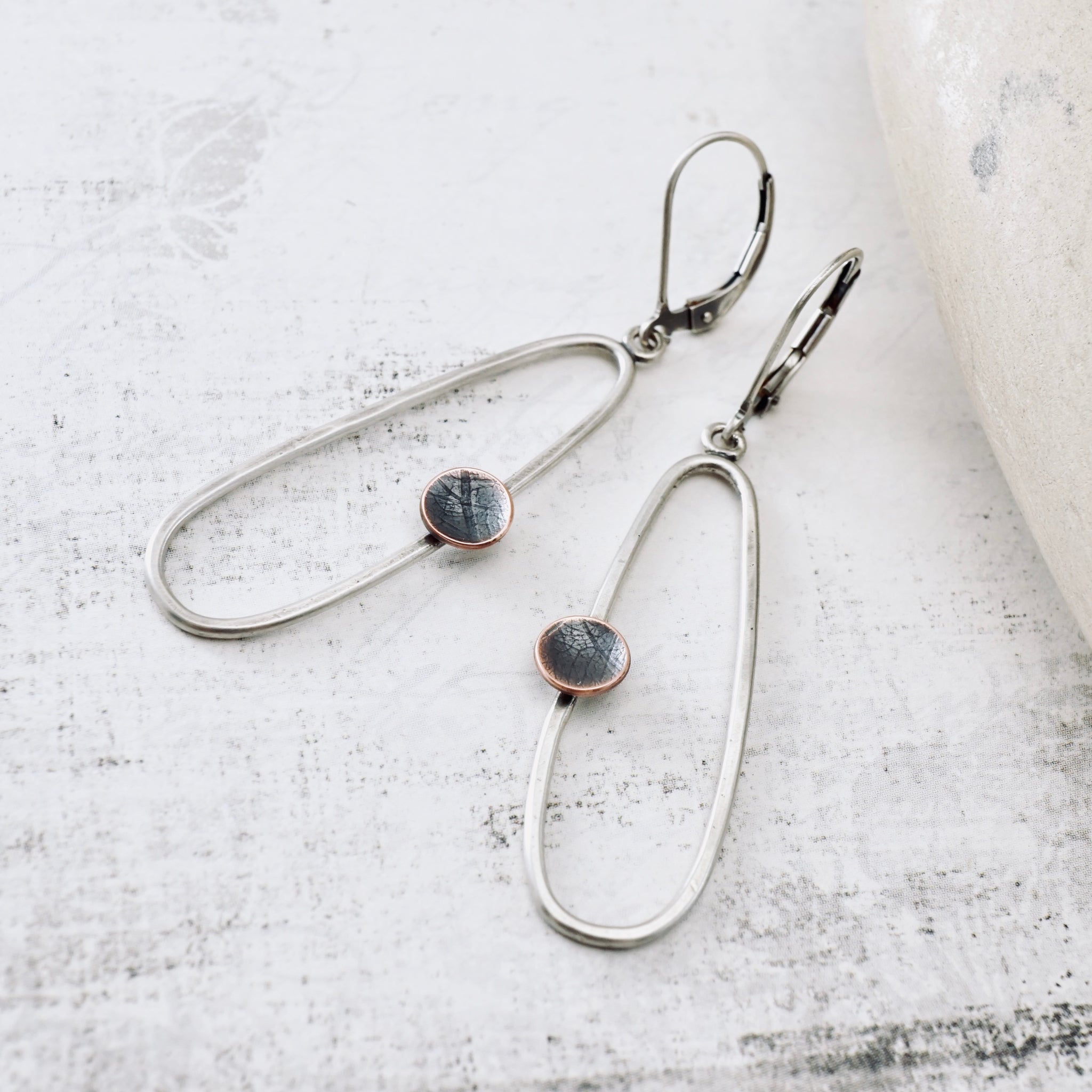 Graceful and refined, these hand-forged Sterling Silver earrings feature elongated loops with softly domed pods in copper that add texture to the minimalist look. The lever back ear wires add a secure, polished touch while keeping them comfortable and easy to wear all day.