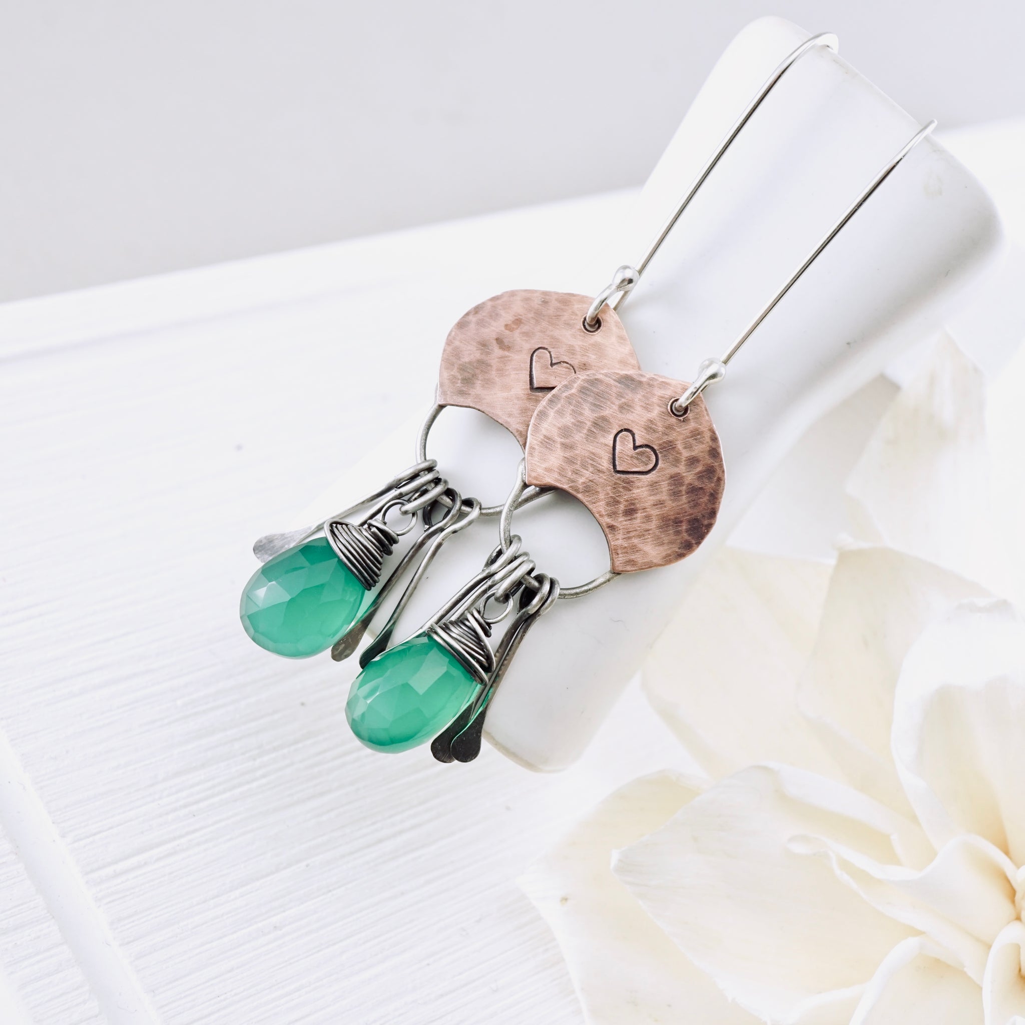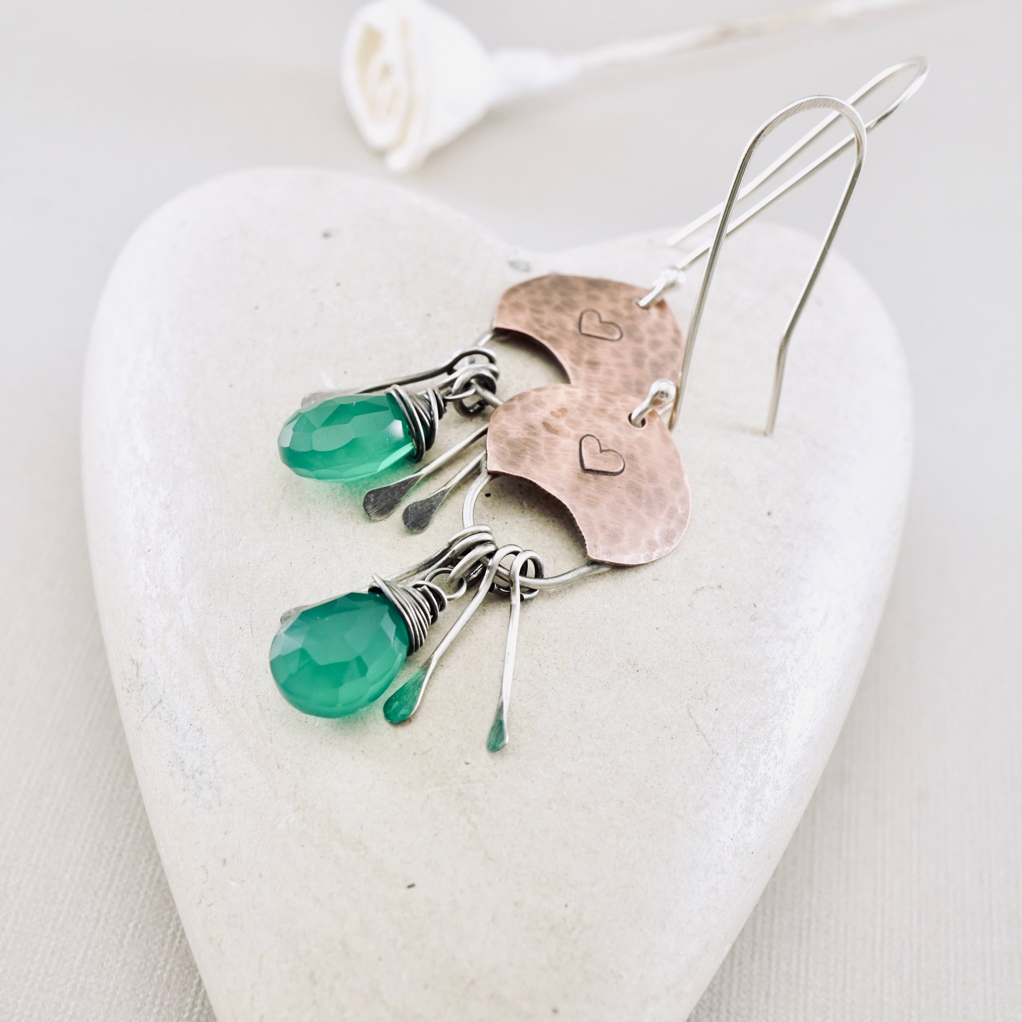 Below, faceted green onyx drops bring a fresh pop of color, wrapped by hand in sterling silver and paired with small dangling silver elements that move and shimmer as you walk. The mix of copper and silver gives these earrings a playful balance, warm and cool, soft and strong, all at once.