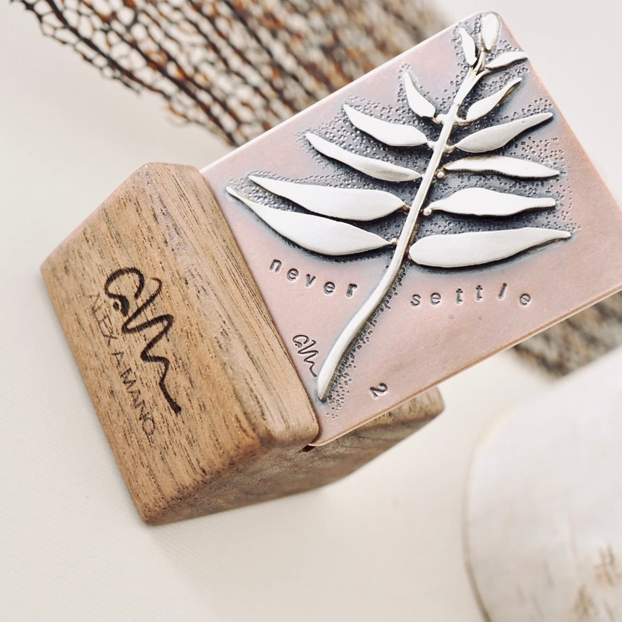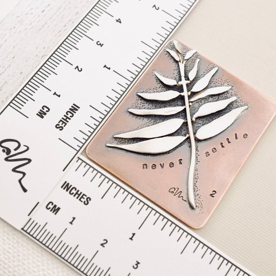 A celebration of growth and resilience, this layered art tile features a graceful sterling silver fern soldered over a warm copper background, with the words never settle hand-stamped as a quiet yet powerful reminder. The piece is finished with subtle oxidation and soft polishing to reveal depth and contrast.
