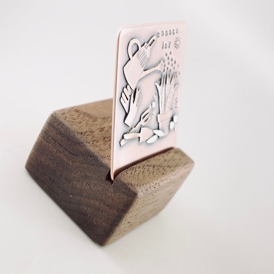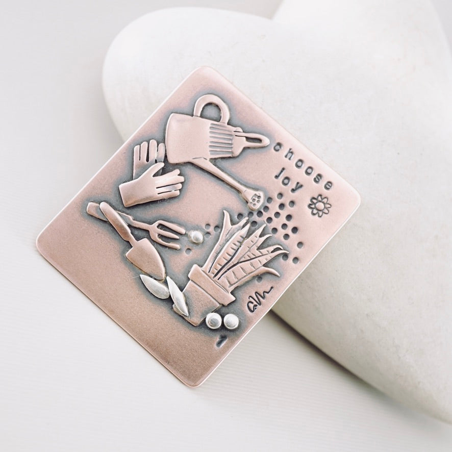 This one-of-a-kind tile is hand-fabricated in layers of sterling silver and copper, creating a charming garden scene with tools, gloves, and a reminder to choose joy. Each element is individually soldered, textured, and oxidized to highlight the details, making every piece truly unique.