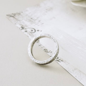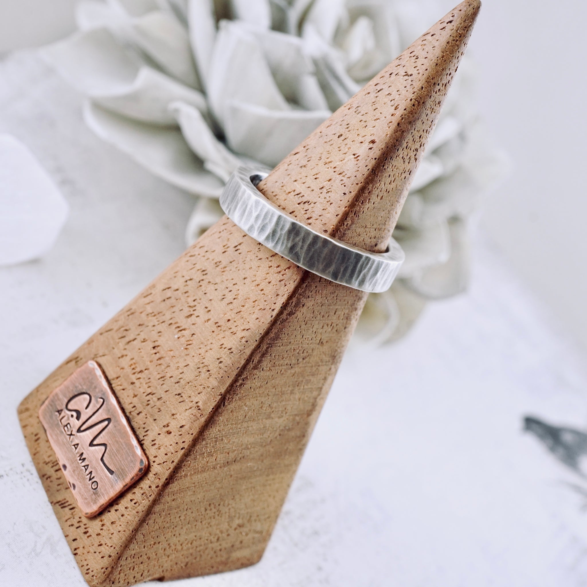 A bold silver band with a strong presence. Hand-fabricated from substantial 4x2 mm sterling silver band, this ring has a subtle hammered texture that reflects light beautifully from every angle. A balanced, earthy feel that's elegant yet unpretentious. (Other finishes available, see pictures)