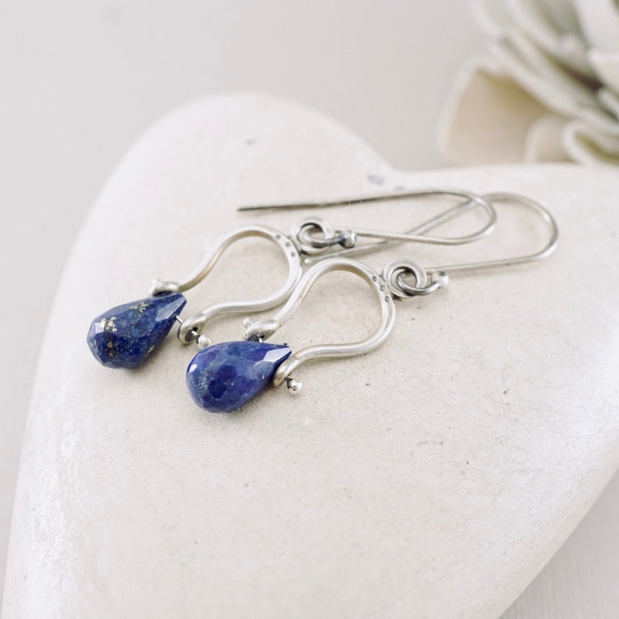 Materials: Lapis Lazuli drops, hand-forged Sterling Silver frames, French-style ear wires