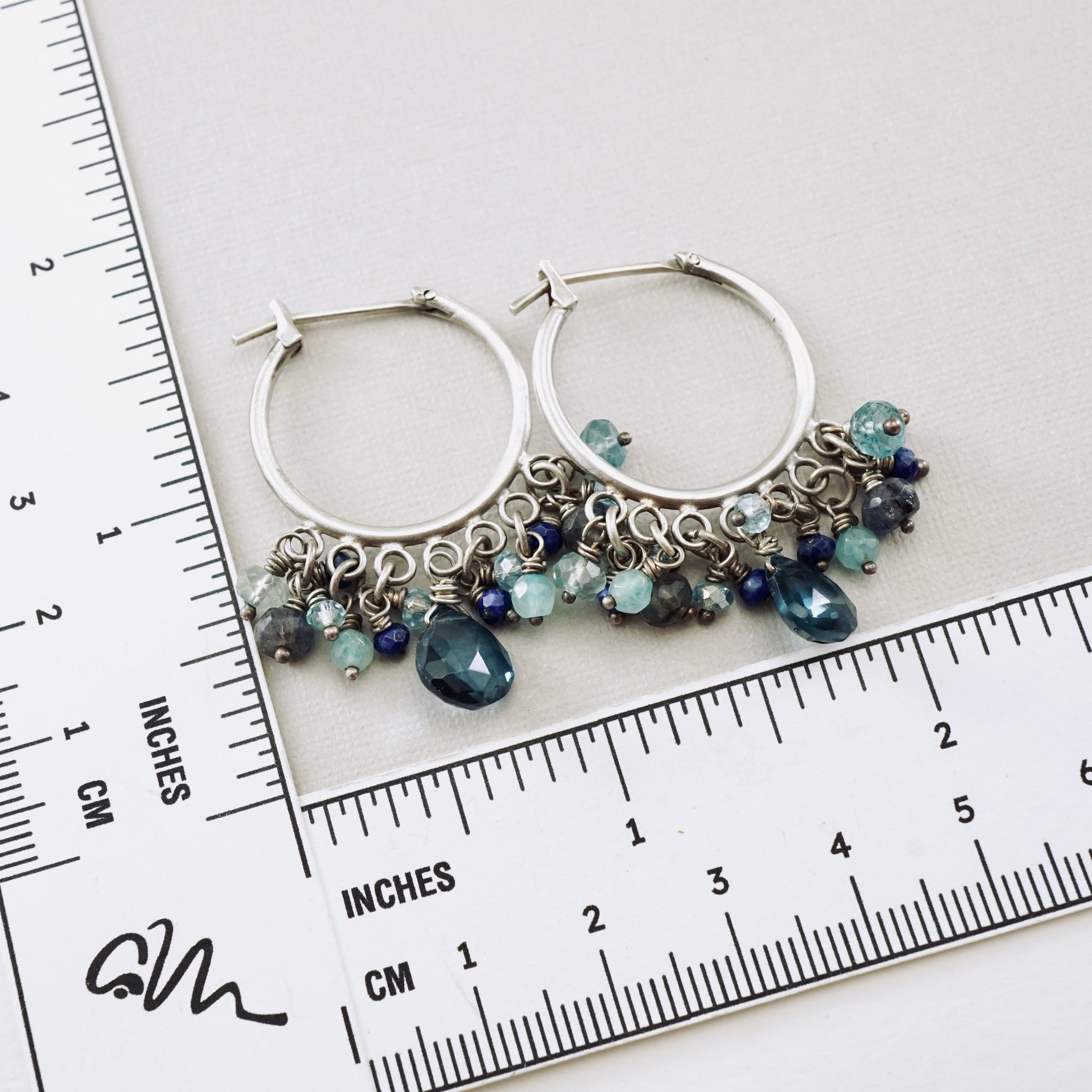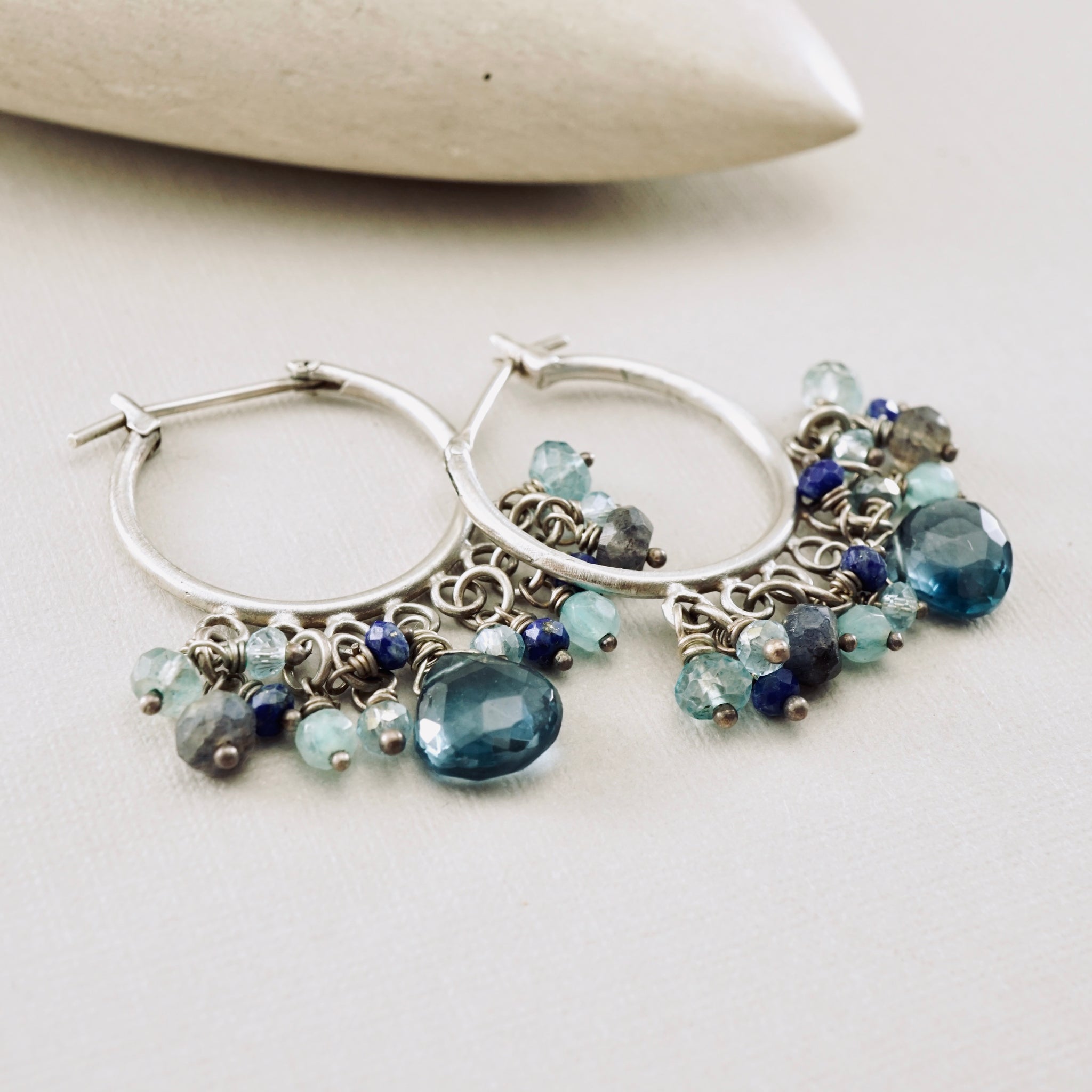 A dance of blues and silvers — these handcrafted hoops shimmer with the colors of the sea. Faceted gemstones like London Blue Topaz, Aquamarine, Labradorite, and Lapis Lazuli sway gently from Sterling Silver hoops, catching light and movement with every turn. Elegant yet playful, they bring a refreshing ocean vibe to any look.