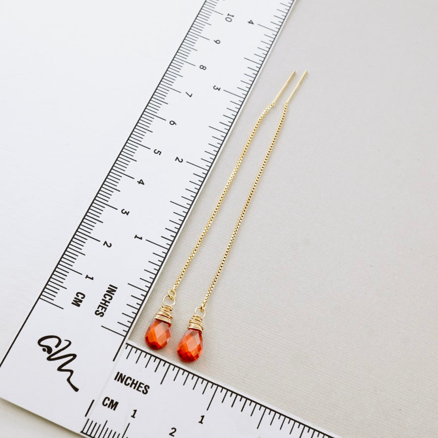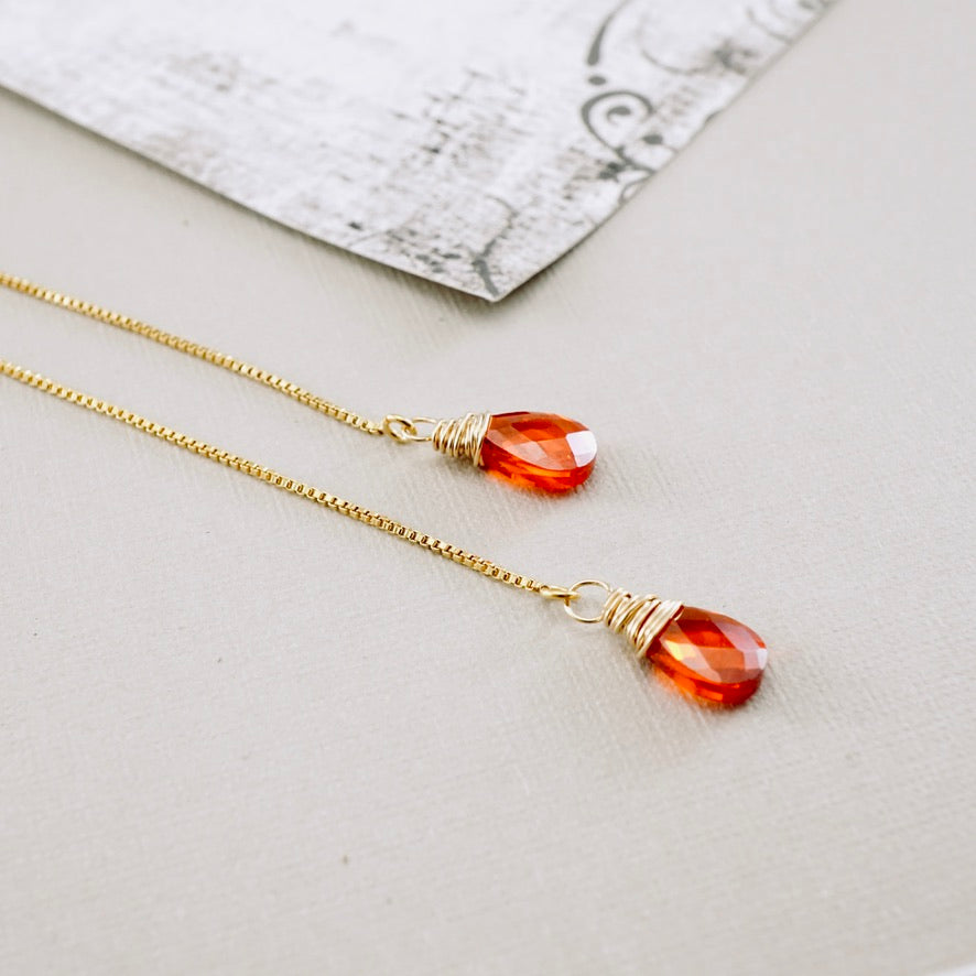 Materials: Faceted orange CZ drops, gold-filled threaders. Cubic zirconia (CZ) is a lab-created gemstone known for its brilliance and clarity — it captures light beautifully, giving you the sparkle of a precious stone in an ethical, accessible way.