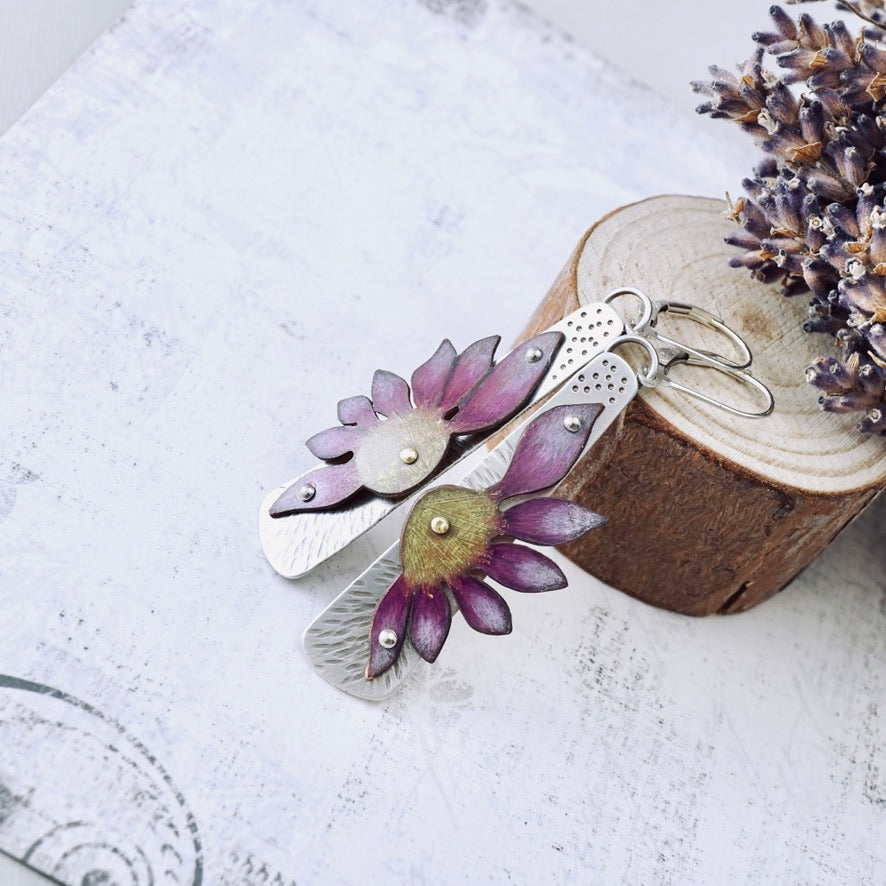 Graceful and expressive, these tapered drop earrings feature hand-cut wildflower petals in rich mulberry tones layered over a warm golden center. Each piece is individually colored with Prismacolor pigments, creating subtle variations and depth that make every pair one of a kind. Lightweight and full of movement, they bring a soft statement of color and artistry to your everyday wear.
